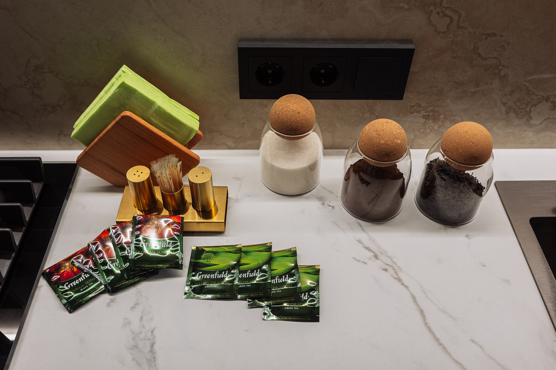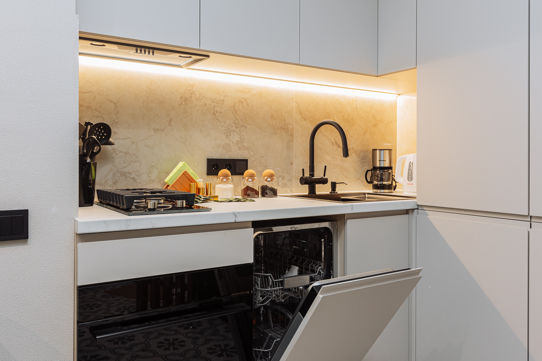 - плита, кофемашина для приготовления кофе, микроволновка, чайник, холодильник, посудомоечная машина