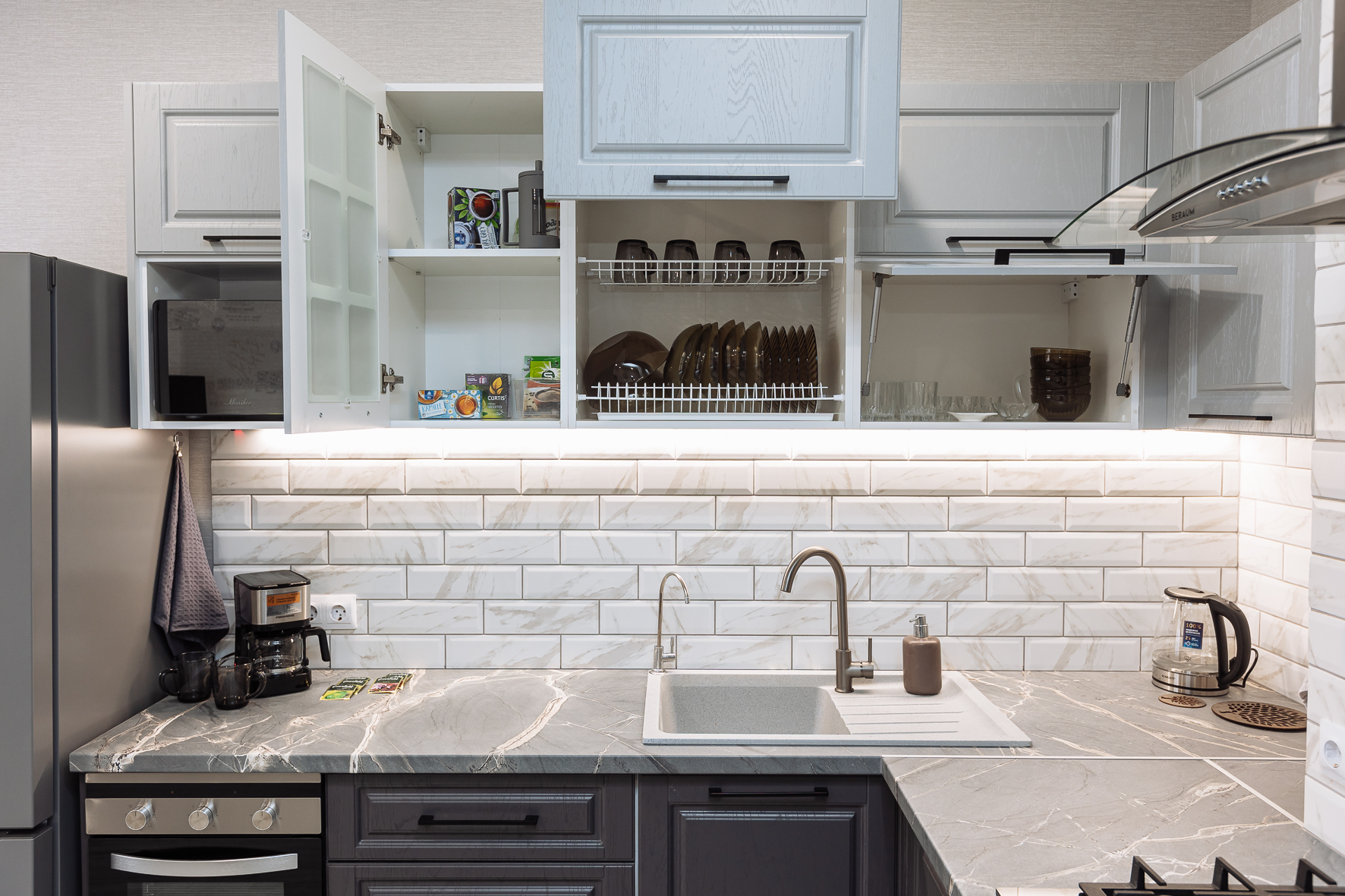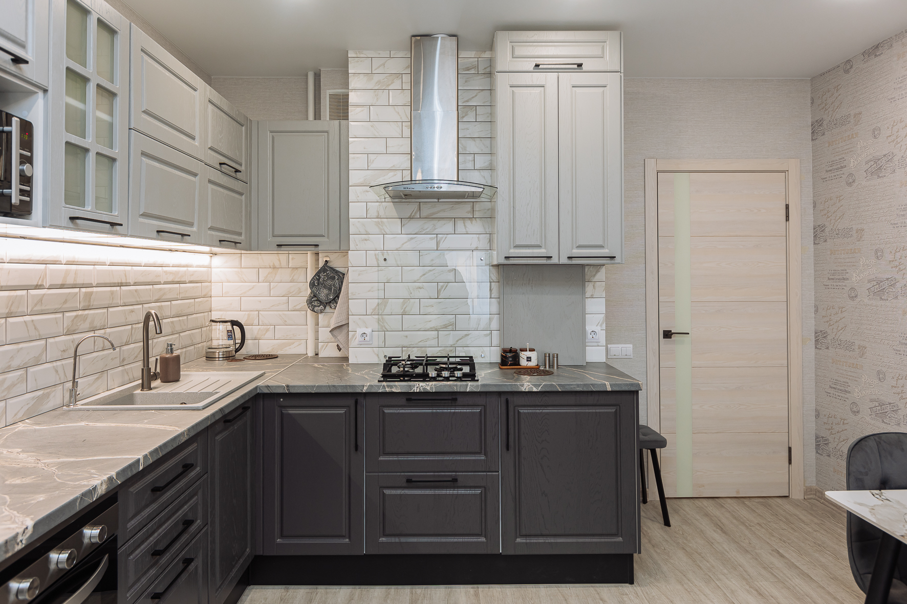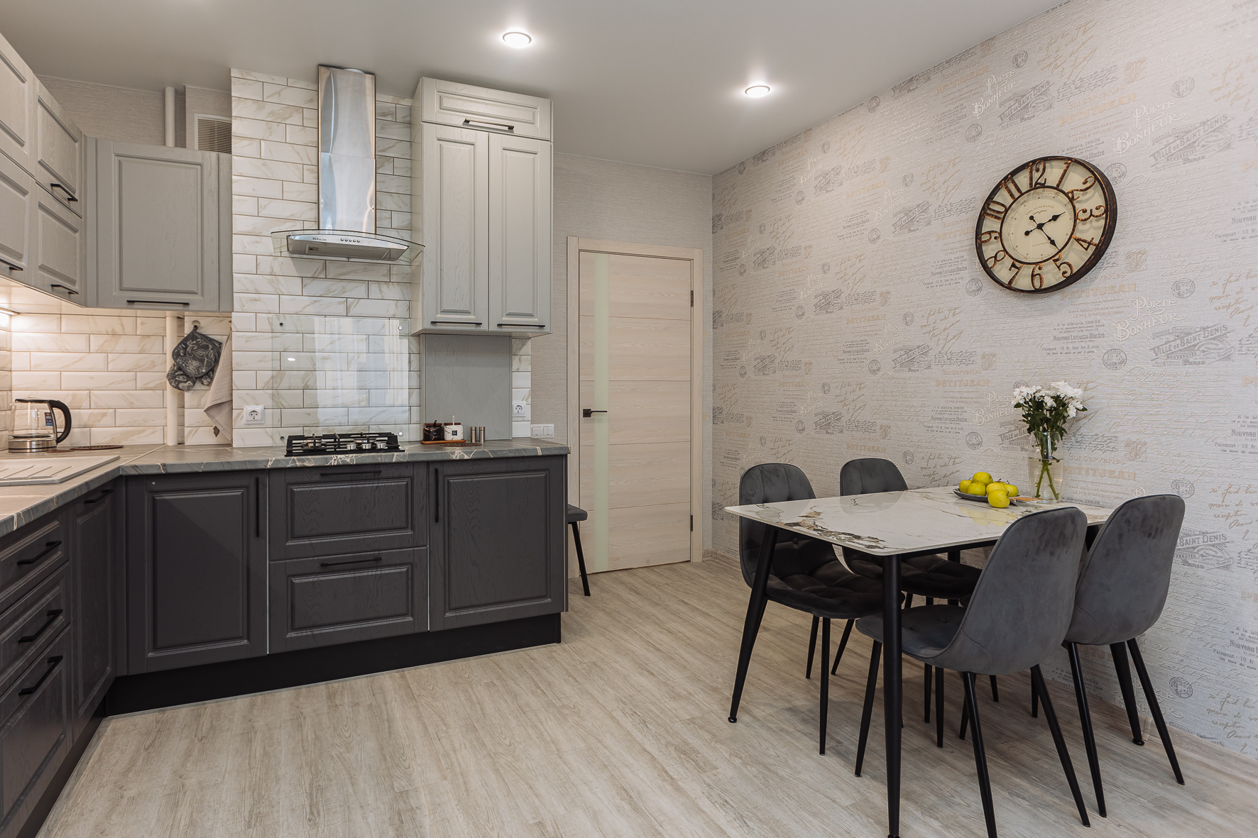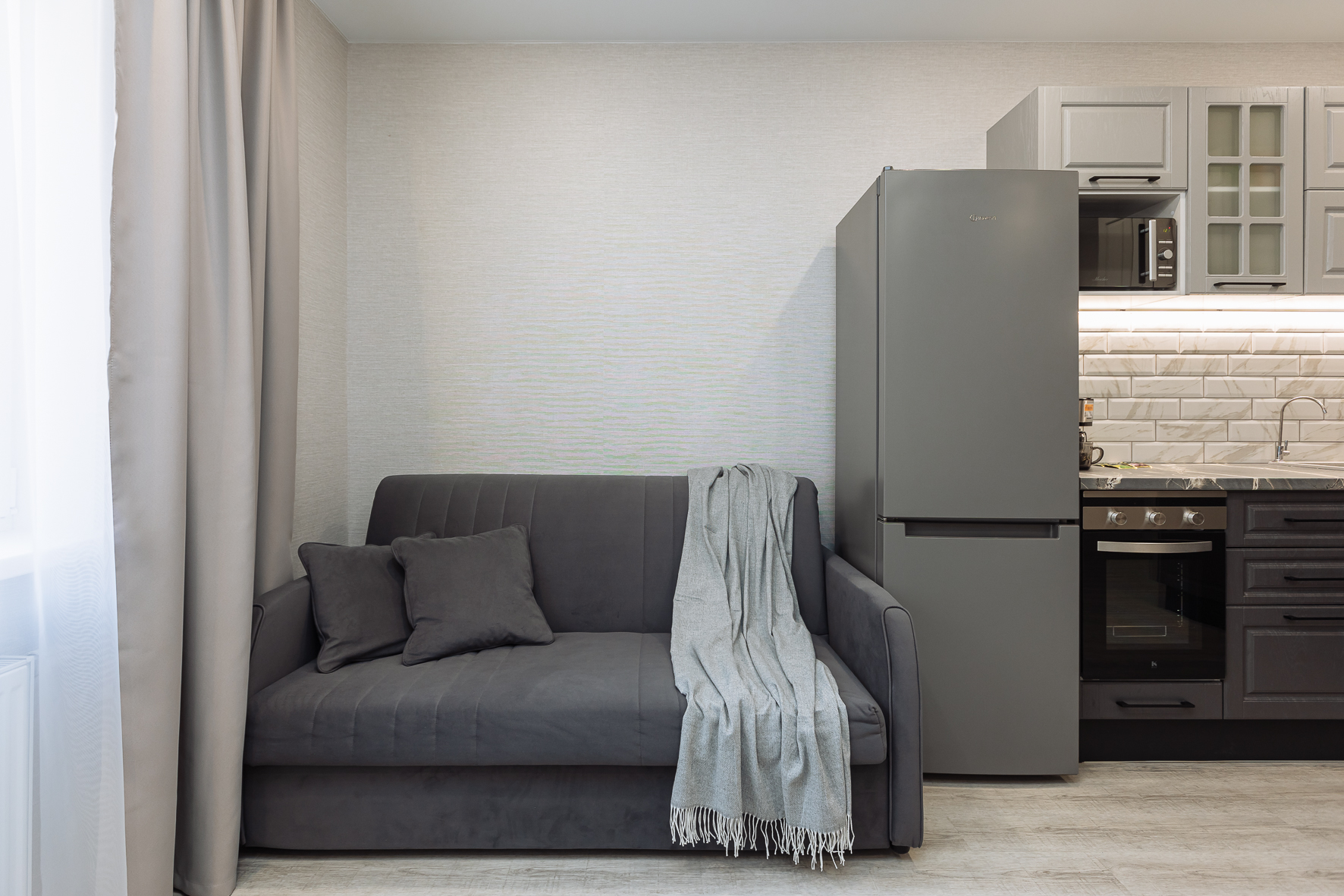 Оборудованная кухня: плита, холодильник, духовой шкаф.