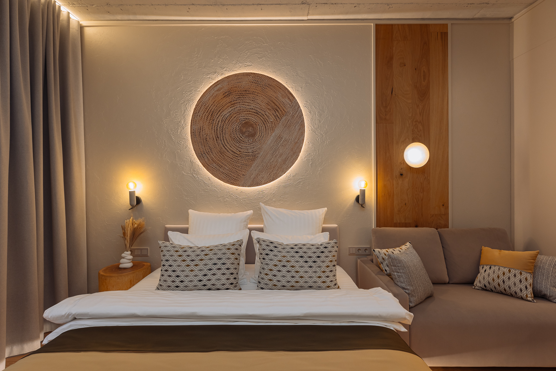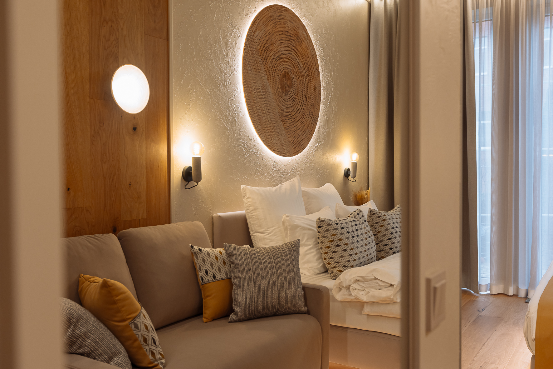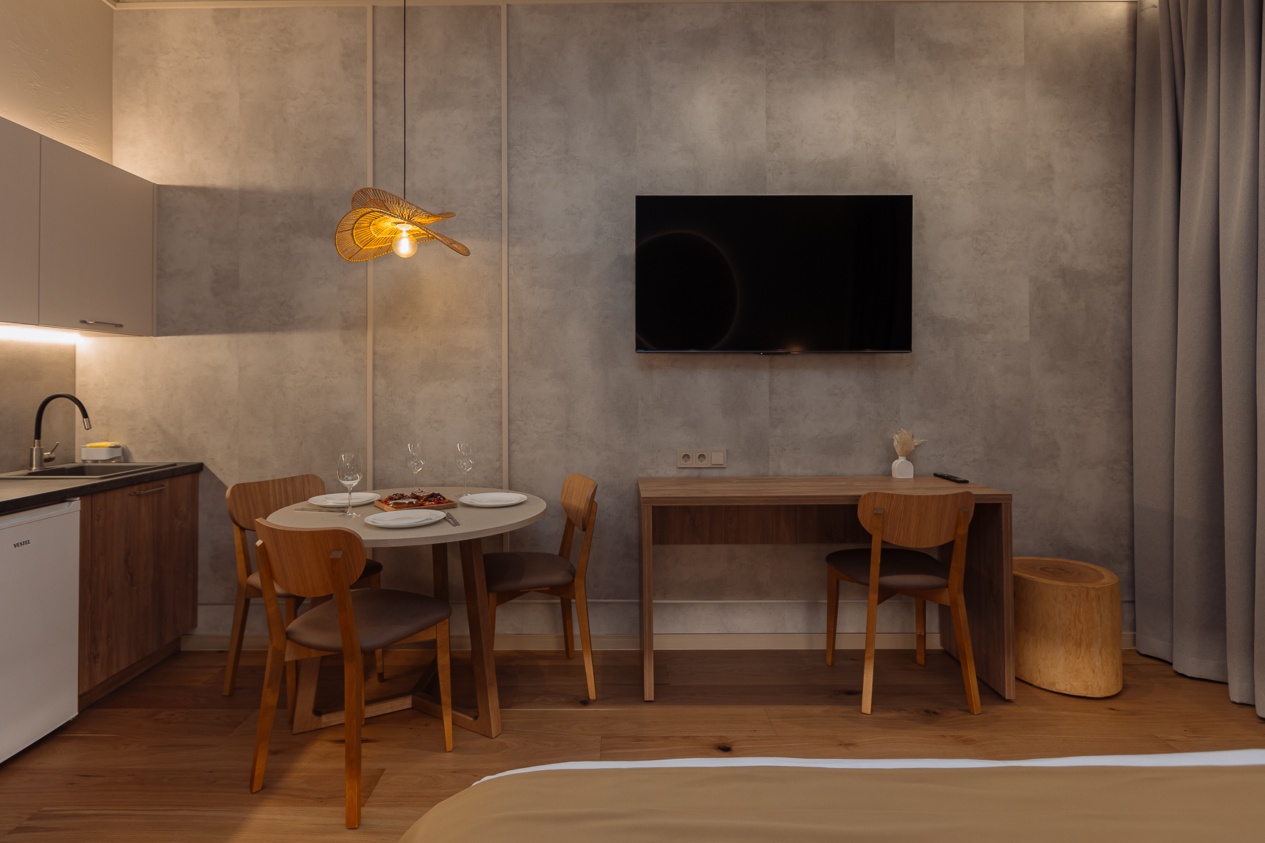 Апартаменты с качественным ремонтом, натуральным паркетом и тёплым полом, который согревает даже в прохладные дни. Прикроватные тумбы из массива дерева и тёплое дерево под ногами создают атмосферу настоящего дома, а не съёмного жилья.