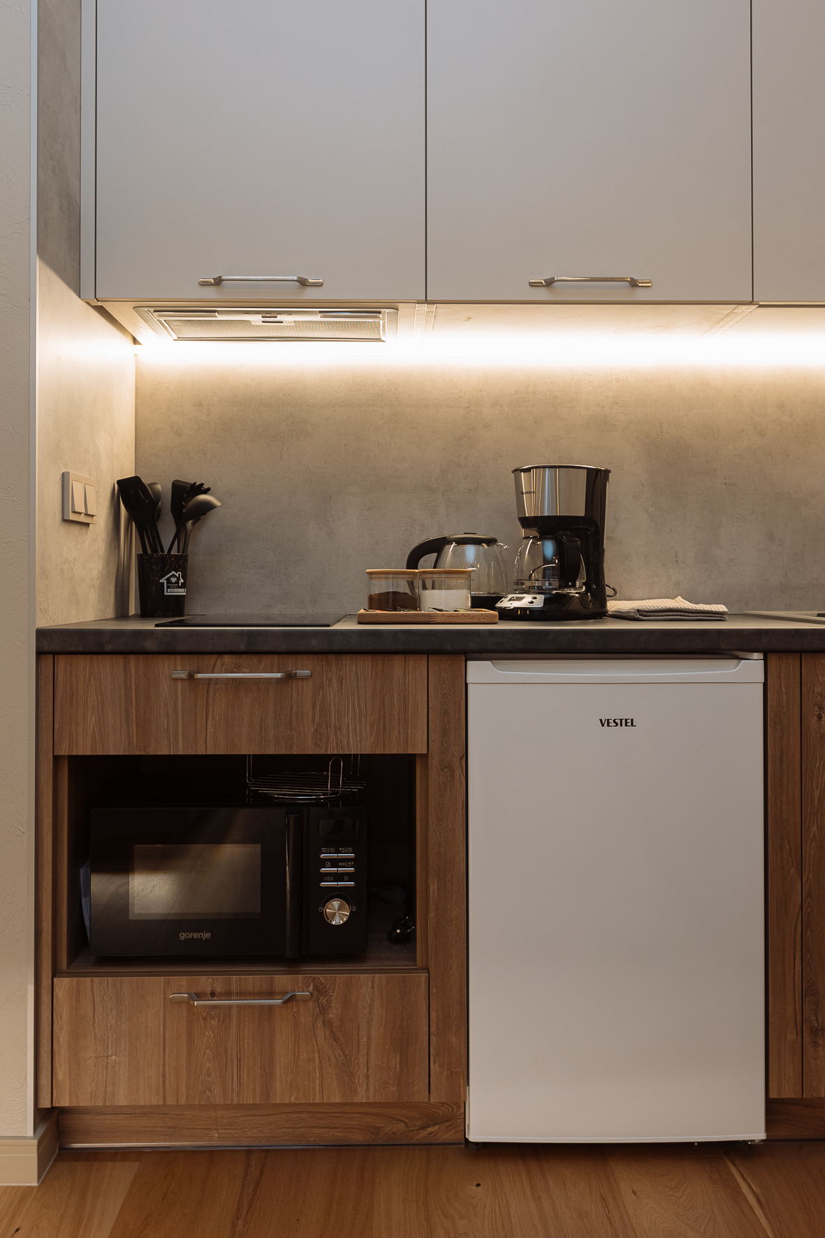 плита, микроволновка, чайник, кофемашина, посуда, кастрюли и сковороды, чай, кофе, соль, сахар
