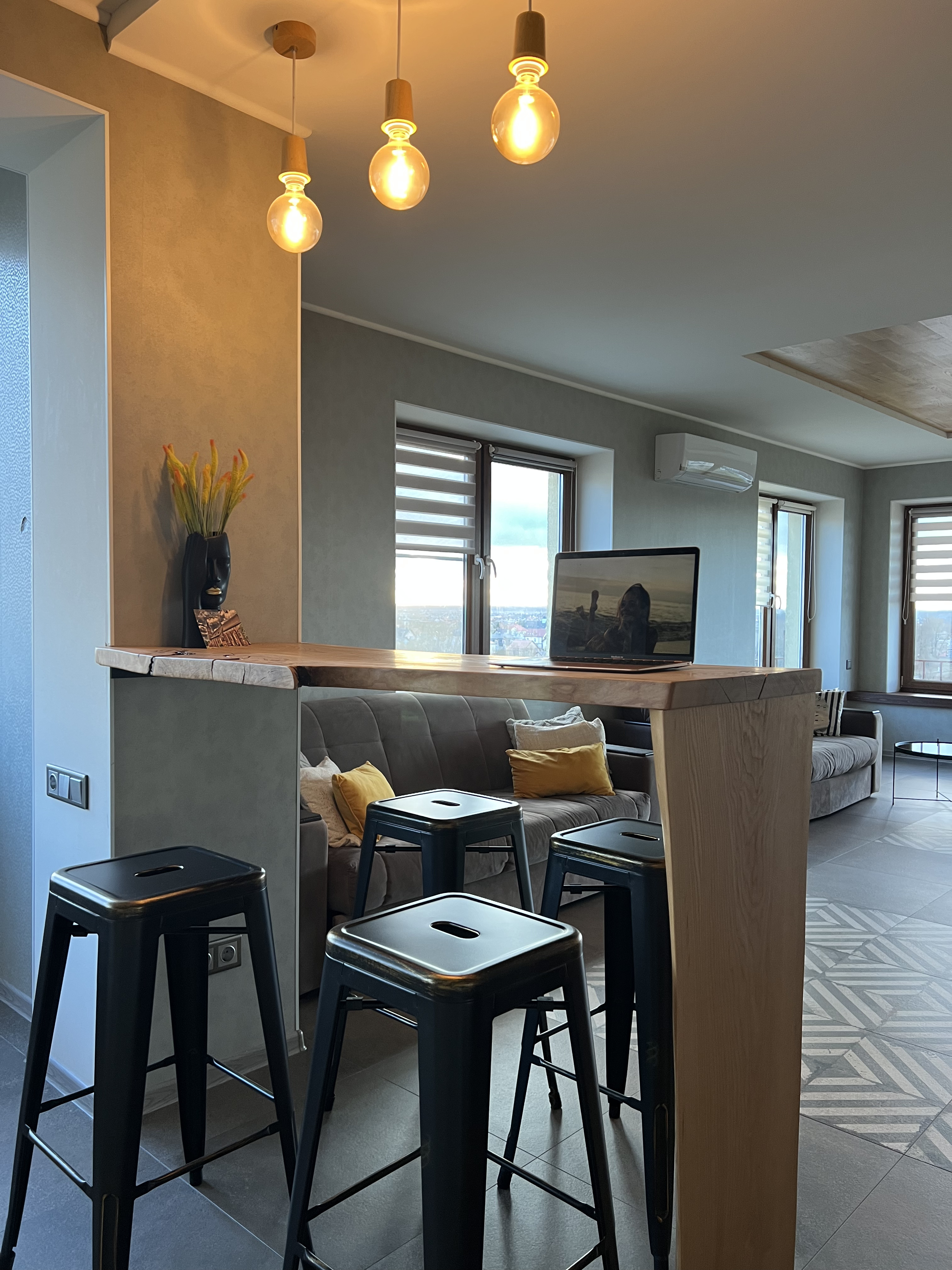 У нас есть зона отдыха и отдельная кухня. Здесь с комфортом можно разместиться 4 взрослым или семье с детьми.